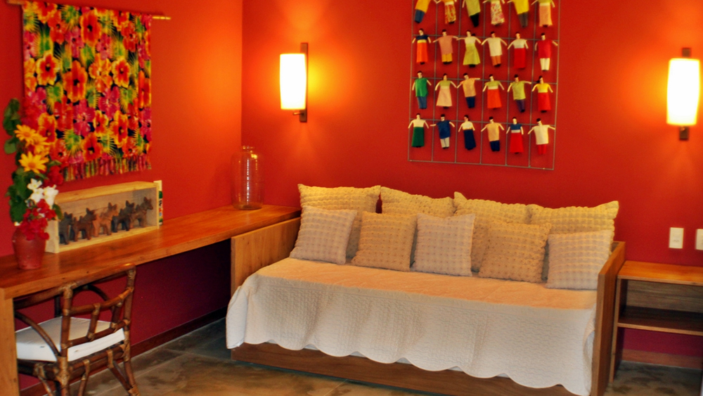 As cores da pousada são intensas e tipicamente nordestinas -vermelho, azul, verde e amarelo. Um ambiente bem colorido, único e especial.